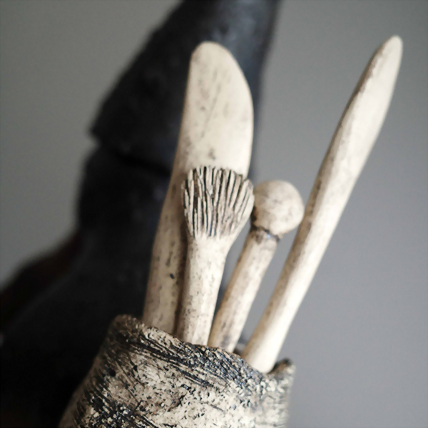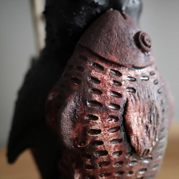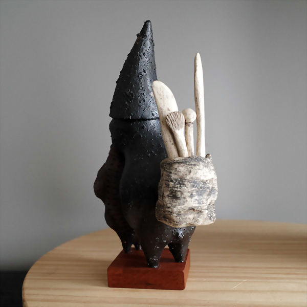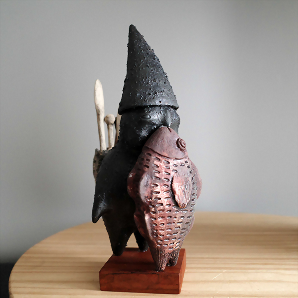 The fish-eating dwarf is going to a picnic with utensils on his back.